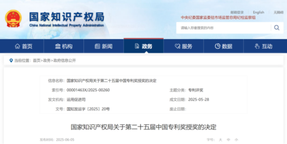 2025年6月5日,国家知识产权局发布关于第二十五届中国专利奖授奖的决定。2024年12月23日,国家知识产权局曾对第二十五届中国专利奖评审结果进行了公示。共评选出中国专利金奖预获奖项目30项,中国外观设计金奖预获奖项目10项,中国专利银奖预获奖项目60项,中国外观设计银奖预获奖项目15项,中国专利优秀奖预获奖项目610项,中国外观设计优秀奖预获奖项目47项。上海波拓代理的一件发明专利荣获“中国专利优秀奖”,具体信息如下:中国专利奖是我国知识产权领域的最高奖项,该奖项由国家知识产权局与世界知识产权组织(WIPO)共同评选颁发,